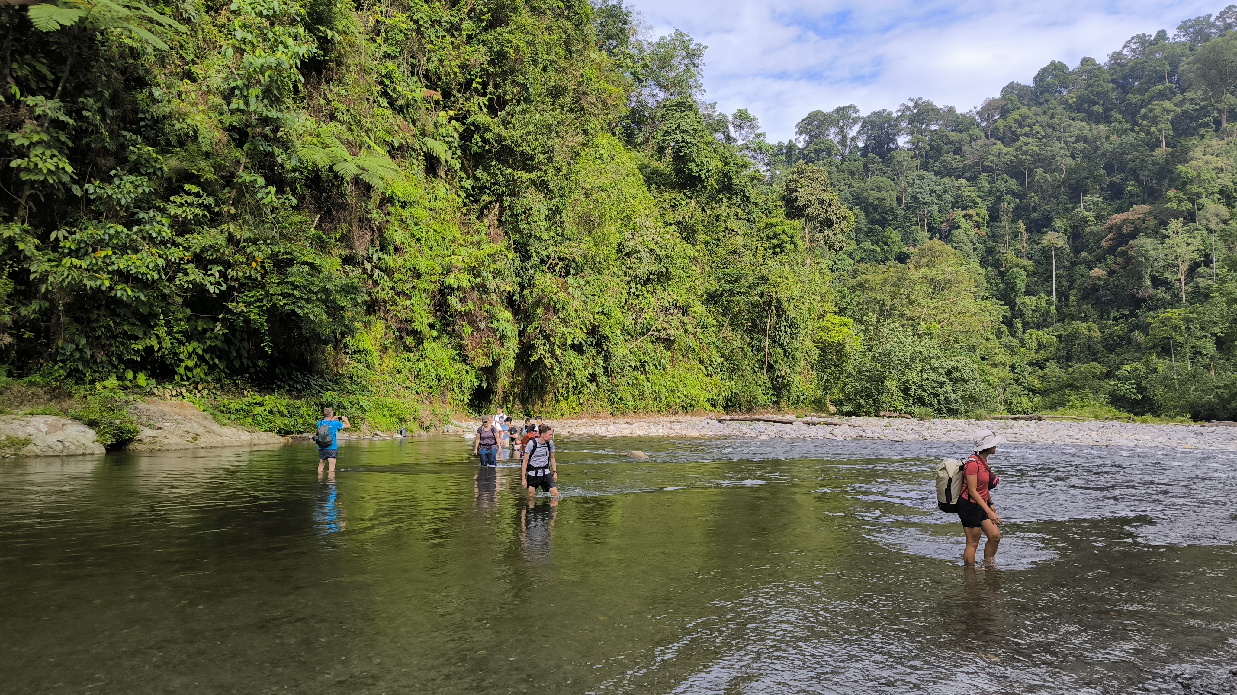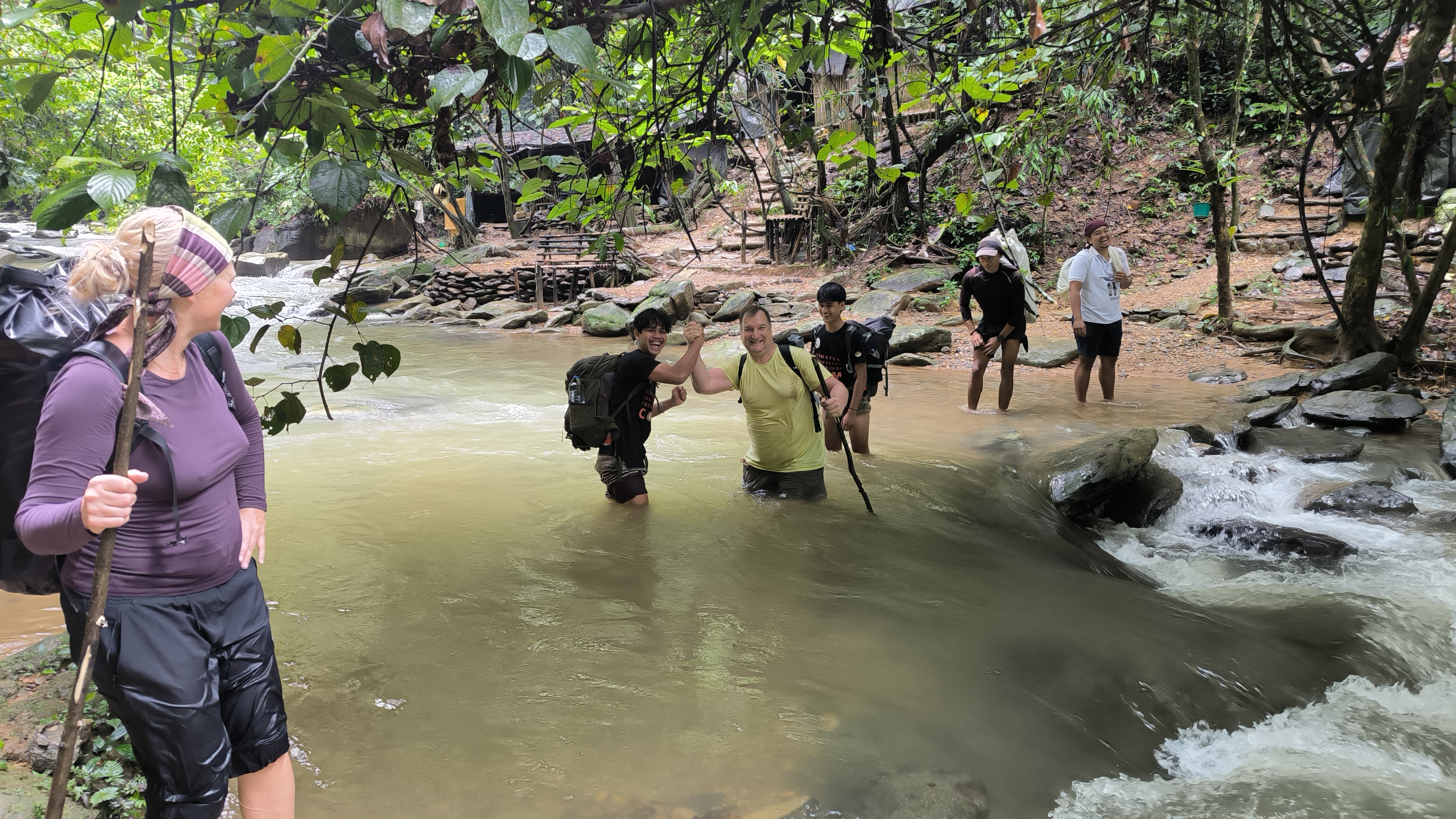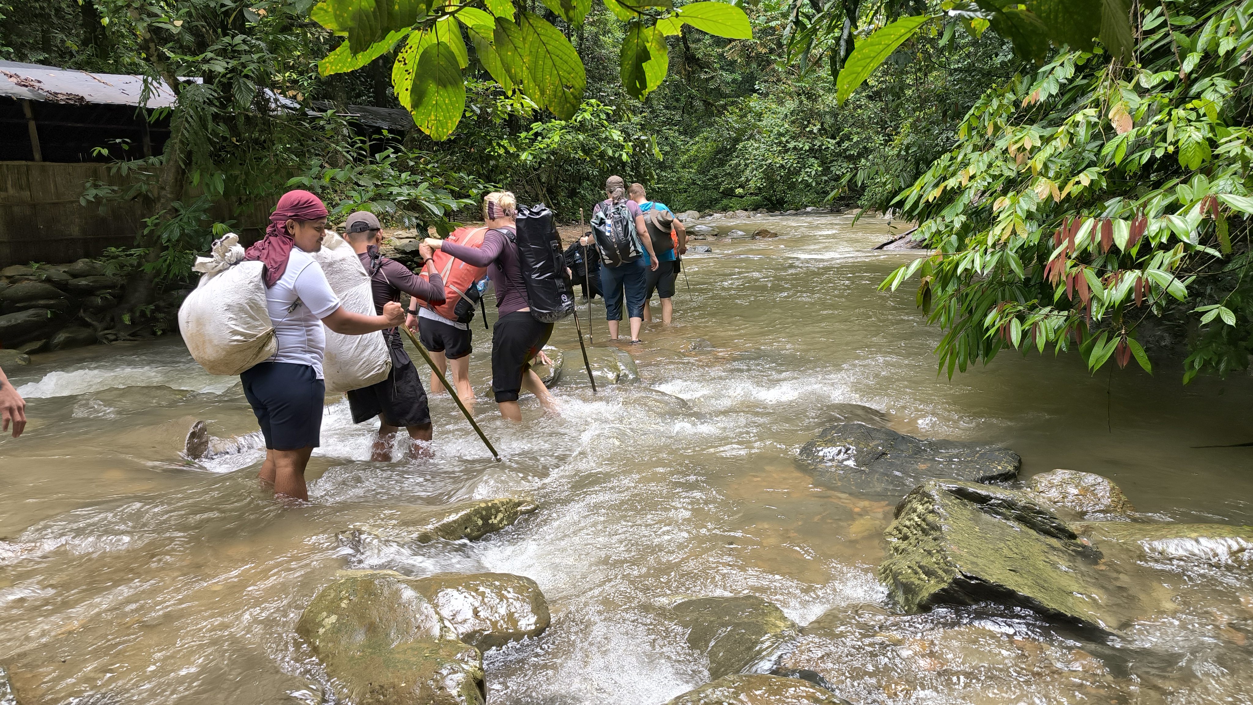 Nach einem kurzen Spaziergang überqueren wir den Bohorok-Fluss und betreten den Sumatra-Regenwald. Während wir die Hügel auf und ab zur Westseite des Nationalparks wandern, zeigen uns die Guides verschiedene Tier- und Pflanzenarten und erklären uns alles zum Regenwald und seiner Artenvielfalt. Wenn wir Glück haben, kreuzen Gibbons, Thomasblattaffen, Langschwanz- und Zopfmakaken, fliegende Eichhörnchen, Sumatra-Pfauen, Nashornvögel und wilde Orang-Utans unseren Weg. Am Nachmittag erreichen wir den kleinen Fluss Jambur Batu neben einem großen Wasserfall, wo wir auf einem Campingplatz übernachten. Hier können wir im Fluß schwimmen, entspannen und unseren Nachmittagskaffee und Tee genießen. Das Team bereitet unser Dschungeldinner mit lokalen indonesischen Gerichten am offenen Lagerfeuer zu. Am Abend haben wir die Möglichkeit, Spiele zu spielen, am Feuer zu singen oder einfach nur in die Sterne zu schauen und den ersten Tag unserer Wanderung Revue passieren zu lassen. Zelte, Matratzen, Kissen und Schlafsäcke sorgen für eine angenehme Dschungelnacht.