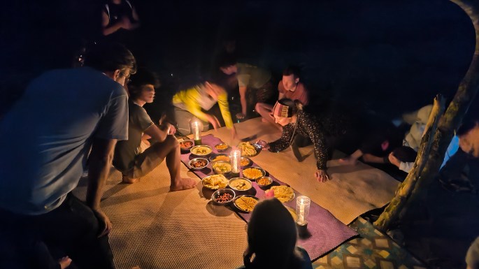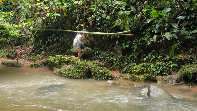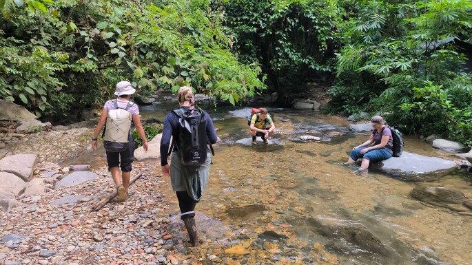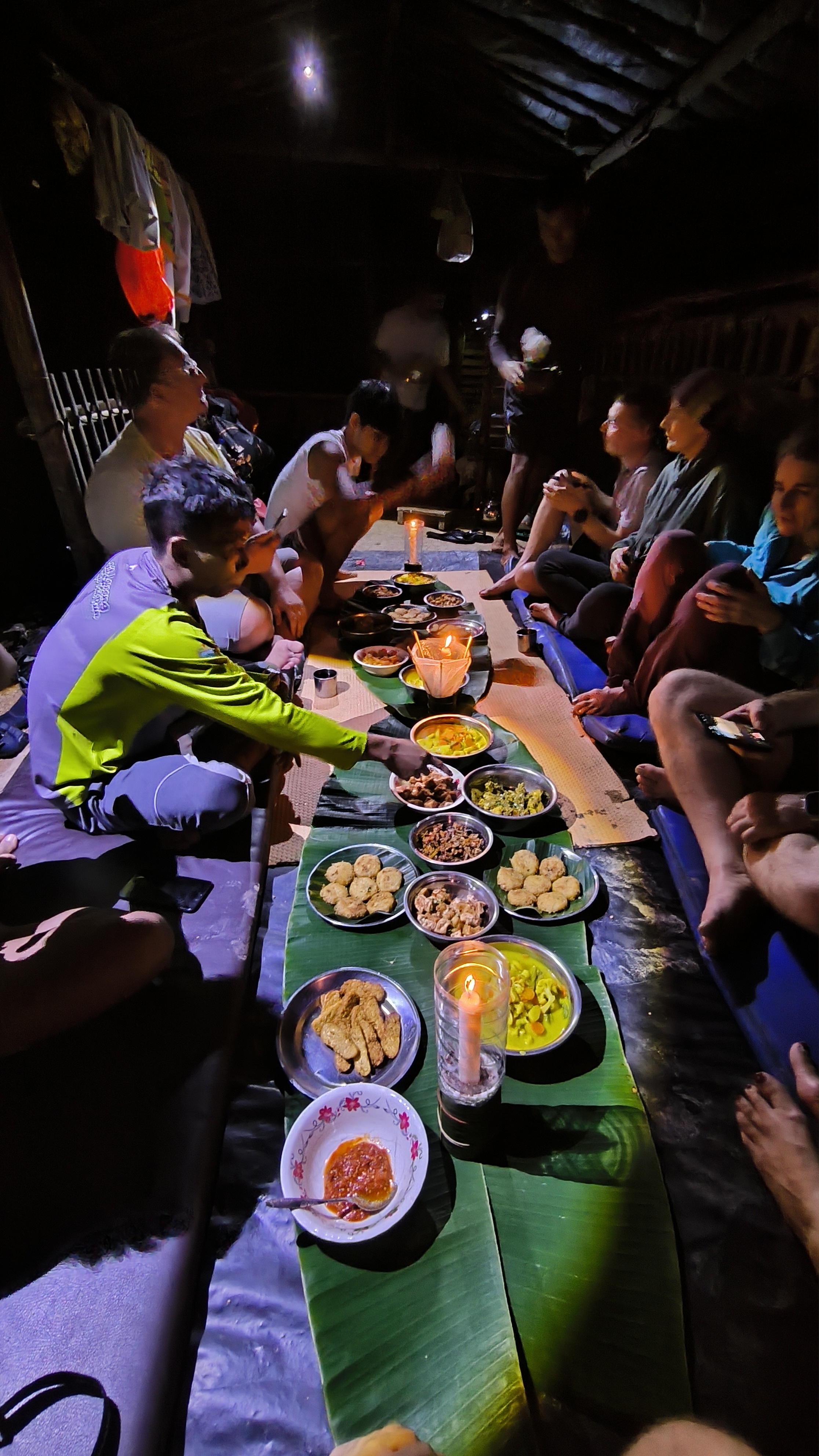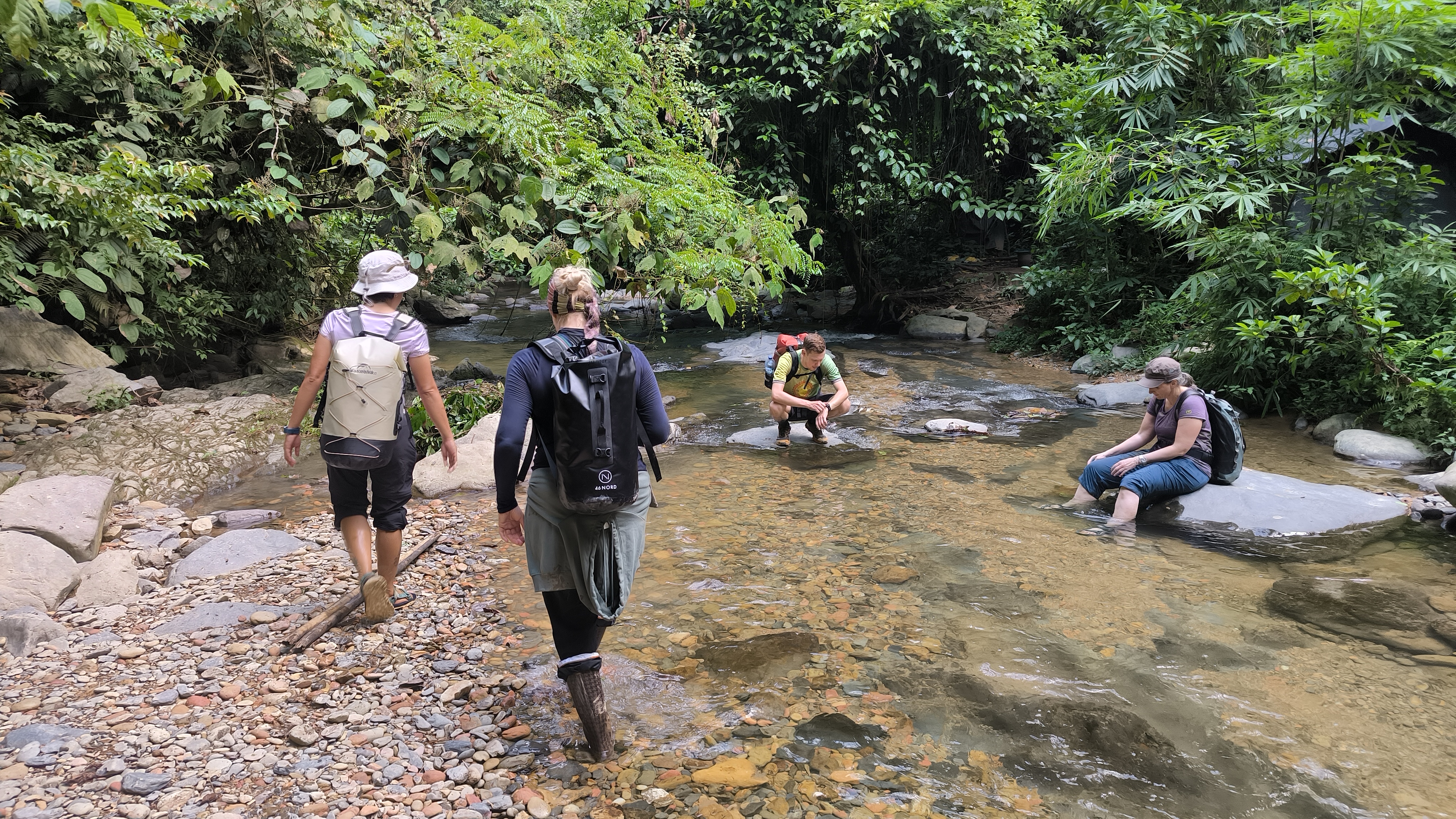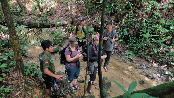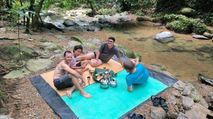 Nach einem kurzen Spaziergang überqueren wir den Bohorok-Fluss und betreten den Sumatra-Regenwald. Während wir die Hügel auf und ab zur Westseite des Nationalparks wandern, zeigen uns die Guides verschiedene Tier- und Pflanzenarten und erklären uns alles zum Regenwald und seiner Artenvielfalt. Wenn wir Glück haben, kreuzen Gibbons, Thomasblattaffen, Langschwanz- und Zopfmakaken, fliegende Eichhörnchen, Sumatra-Pfauen, Nashornvögel und wilde Orang-Utans unseren Weg. Am Nachmittag erreichen wir den kleinen Fluss Jambur Batu neben einem großen Wasserfall, wo wir auf einem Campingplatz übernachten. Hier können wir im Fluß schwimmen, entspannen und unseren Nachmittagskaffee und Tee genießen. Das Team bereitet unser Dschungeldinner mit lokalen indonesischen Gerichten am offenen Lagerfeuer zu. Am Abend haben wir die Möglichkeit, Spiele zu spielen, am Feuer zu singen oder einfach nur in die Sterne zu schauen und den ersten Tag unserer Wanderung Revue passieren zu lassen. Zelte, Matratzen, Kissen und Schlafsäcke sorgen für eine angenehme Dschungelnacht.